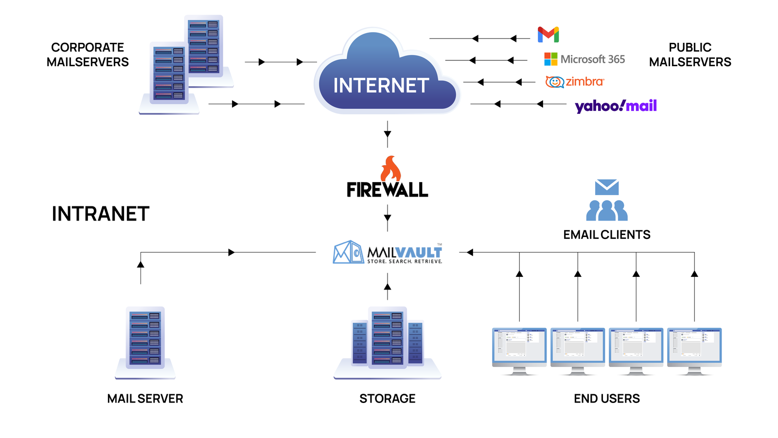 - MailVault’s multi-protocol, multi-mail client and raw email support allows for some incredibly flexible deployment scenarios.